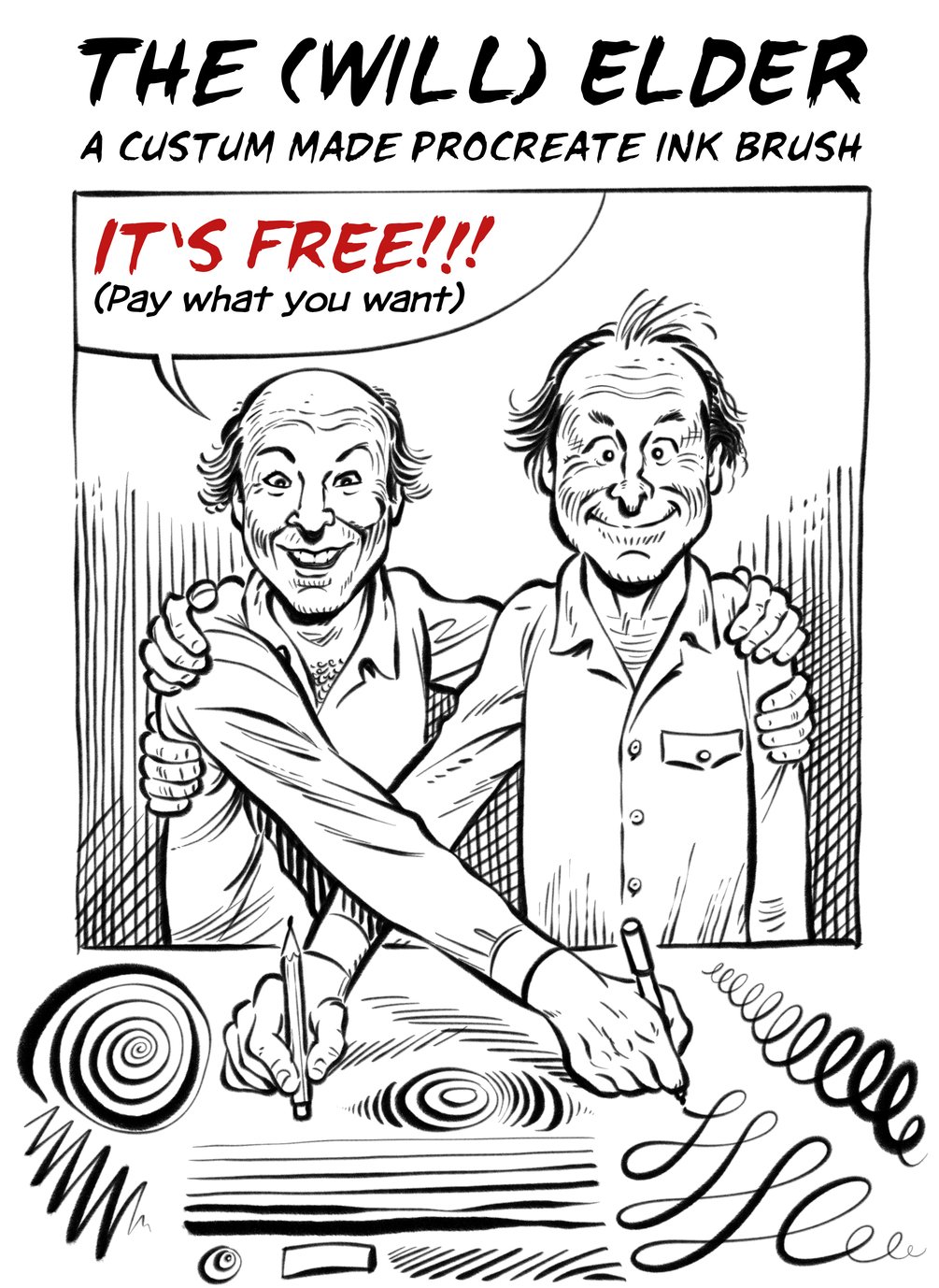 Here's my first custom-made Procreate ink brush set with more than 20 brushes for inking and special effects. It's dedicated to the great Will Elder, an American illustrator and comic book artist who worked in numerous areas of commercial art but is best known for a zany cartoon style that helped launch Harvey Kurtzman's MAD comic book in 1952.